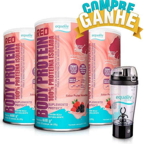 Informações sobre Compre 3unid Body Protein Equaliv e Ganhe 1 Coqueteleira Mixer 450ml Características da Coqueteleira Mixer:Capacidade: 450mlAlimentação: 02 pilhas AAA (não inclusas)Material: Acrílico Equaliv Body Protein Red é um produto da família Body Protein, agora com um delicioso sabor frutas vermelhas. Equaliv Body Protein Red é uma proteína isolada com tecnologia, a base de peptídeos de colágeno específico para os músculos É formado por peptídeos de colágeno isolado que funcionam como fonte de proteína de alta qualidade para resultados de alta performance. Com a tecnologia alemã BODYBALANCE™, fornece 27g de proteína por porção, que atuam de forma específica no ganho de massa muscular e perda de gordura, gerando o encontro perfeito com o músculo. É um produto clean label [zero açúcar, zero glúten e sem adoçantes artificiais e polióis], e tem o delicioso sabor frutas vermelhas. Não é proveniente do soro do leite, sendo assim, pode ser consumido tranquilamente por todos aqueles intolerantes à lactose.Estudo mostra que 15g/dia + 3h de exercícios físicos por semana resultam em 50% de aumento na efetividade do treino, se comparado às pessoas que não ingeriram fonte de proteína. INGREDIENTESCacau: Colágeno hidrolisado, cacau em pó, (edulcorantes naturais) taumatina e glicosídeos de esteviol, (espessante) goma xantana e (antiumectante) dióxido de silício e (aromatizantes) aroma idêntico ao natural de creme e aroma idêntico do natural de chocolate.Frutas Vermelhas: Colágeno hidrolisado, morango, amora e framboesa em pó, (aromatizantes) aromas naturais de baunilha e morango (espessante) goma xantana, (acidulante) ácido cítrico, frutas vermelhas, (antiumectante) dióxido de silício e (edulcorantes naturais) taumatina e glicosídeos de esteviol. NÃO CONTÉM GLUTEN.Neutro: Colágeno hidrolisado, (edulcorantes naturais) taumatina e glicosídeos de esteviol, (espessante) goma xantana e (antiumectante) dióxido de silício e (aromatizantes) aroma idêntico ao natural de creme.Modo de Usar:Consumir de 20 g (1 medida/ 1 scoop) a 40 g (2 medidas/ 2 scoops) ao dia, antes e/ou depois do treino ou conforme orientação do médico e/ou nutricionista. INFORMAÇÃO NUTRICIONAL – NEUTROPorção: 20g (1 Medida/1 Scoop) Quantidade por porção%VD*Valor Energético108 kcal = 454 kJ5Carboidratos0 g, dos quais:0Açúcar0 g**Proteínas27 g36Sódio75 mg3 NFORMAÇÃO NUTRICIONAL – FRUTAS VERMELHASPorção de 20 g (1 medida/ scoop)Quantidade por porção%VD*Valor energético63 kcal = 264 kJ3Gorduras Totais2,2 g0Carboidratos2,2 g, dos quais:0Açúcar0 g**Proteínas13,5 g18Sódio6 mg0 INFORMAÇÃO NUTRICIONAL – CACAUPorção: 20g (1 Medida/1 Scoop)Quantidade por porção%VD* Valor energético60 kcal = 252 kJ6 Carboidratos0 g, dos quais: 0Açúcar0 g** Proteínas15 g20 Fibra Alimentar1,0 g4 Sódio43 mg2 * % Valores Diários com base em uma dieta de 2.000 kcal ou 8.400 kJ. Seus valores diários podem ser maiores ou menores dependendo de suas necessidades energéticas.** Valores Diários não estabelecidos.