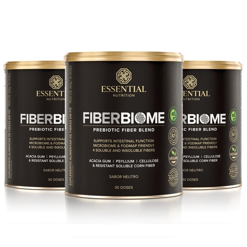 Informações sobre Kit 3unid Fiberbiome Sabor Neutro(300g) - Essential Nutrition Blend de 4 fontes de fibras alimentares, incluindo solúveis e insolúveis, para auxiliar no funcionamento intestinal. Possui certificação FODMAP Friendly, evitando desconfortos, como gases ou estufamento, ao longo da digestão.Ingredientes:Fibra solúvel resistente de milho, goma acácia, celulose microcristalina, psyllium e aroma natural.NÃO CONTÉM GLÚTEN.ALÉRGICOS: PODE CONTER DERIVADOS DE LEITE**Pode apresentar traços como consequência da presença não intencional durante alguma etapa da fabricação das matérias primas ou da linha de produção. TABELA NUTRICIONALPorções por embalagem: 30Porção: 10g (1colher-medida) 10g%VD*Valor energético15 kcal1Carboidratos0 g0 Açúcares totais0 g Açúcares adicionados0 g0Fibras alimentares8,7 g35 Fibras solúveis7,3 g Sódio (mg)26 mg1Não contém quantidades significativas de proteínas, gorduras totais, gorduras saturadas e gorduras trans.Percentual de valores diários fornecidos pela porção.