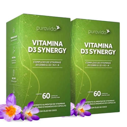 Informações sobre Kit 2 un Vitamina D3 Synergy (60 Cápsulas) - Pura Vida De acordo com a ciência, a vitamina D é, na realidade, um pró-hormônio. É considerada um dos nutrientes mais importantes e essenciais, e estima-se que grande parte da população sofra com efeitos de sua deficiência.Ela age regulando o cálcio e o fósforo na corrente sanguínea, fixando o cálcio nos ossos, sendo assim indispensável para a densidade óssea.A Vitamina D participa do funcionamento muscular e auxilia o funcionamento do sistema imune.É naturalmente produzida na pele em contato direto com a luz solar nas horas de sol mais forte, ao redor do meio-dia, justamente o momento em que muitos evitam a exposição ao sol.O dia a dia da realidade moderna também dificulta essa exposição diária, já que passamos a maior parte de nosso tempo em ambientes fechados ou sombreados por edifícios.Por esses motivos, a suplementação é considerada fundamental por muitos profissionais de saúde.Os especialistas mais atualizados são unânimes em afirmar que precisamos de uma boa quantidade diária – no mínimo 2.000 UIs por dia, que é a dosagem oferecida nesta fórmula da Puravida – a primeira no Brasil atualizada de acordo com a revisão da ANVISA de 2018.Além de uma quantidade eficaz, nossa fórmula contém também outros nutrientes que atuam de forma complementar a vitamina D3, novamente de acordo com a ciência:Vitamina A – Desempenha um importante papel na saúde dos olhos e da visão, do sistema imune e no metabolismo do ferro. Também contribui para a manutenção da pele, das mucosas e auxilia no processo de diferenciação celular.Vitamina K2 – Necessária para garantir que o cálcio (que é melhor absorvido em níveis saudáveis de Vitamina D) seja direcionado para os lugares corretos (ossos).Magnésio – É um dos mais importantes minerais para o organismo, fundamental para o relaxamento do sistema nervoso e muscular, para regular o cálcio, para o equilíbrio de eletrólitos e para o metabolismo energético.Além destes componentes vitais, o Synergy também oferece a total necessidade diária de Selênio, mineral antioxidante que auxilia no funcionamento do sistema imune. INGREDIENTES: Óleo de coco, bisglicinato de magnésio, óleo de girassol prensado a frio (veículo), palmitato de retinol, selenito de sódio, menaquinona, colecalciferol e lecitina de girassol. Composição da cápsula: gelatina, água purificada, glicerina e e cúrcuma. NÃO CONTÉM GLÚTEN. SUGESTÃO DE USO: Ingerir 1 cápsula ao dia ou de acordo com a orientação de um profissional de saúde. RECOMENDAÇÕES: Guardar em local seco, fresco e protegido da luz. INFORMAÇÃO NUTRICIONALPor porção de 1,2 g (1 cápsula)Quantidade por porção%VD*Valor Energético6 kcal / 26 kJ1%Gorduras Totais0,6 g1%Gorduras Saturadas0,4 g2%Vitamina A900 mcg150%Vitamina D32000 UI (50 mcg)1000%Vitamina K100 mcg154%Selênio167 mcg490%Magnésio175 mg67%(*) % Valores Diários de referência com base em uma dieta de 2.000 kcal ou 8400 kJ. Seus valores diários podem ser maiores ou menores dependendo de suas necessidades energéticas. (**) Valor diário de referência não estabelecido. Não contém quantidades significativas de carboidratos, proteínas, gorduras trans, fibra alimentar e sódio.