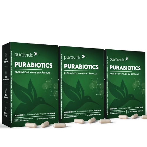Informações sobre Kit 3 un Purabiotics (30 Cápsulas) - Pura Vida TRABALHANDO PARA A SAÚDE DO SEU INTESTINOOs intestinos são um excelente lar para muitas bactérias. Trilhões, para ser mais exato. E isso é uma ótima notícia, pois muitas delas ajudam no processo digestivo e são importantes aliadas da sua saúde. Chamamos essas espécies benéficas de probióticos.Hoje, os pesquisadores já conseguiram mapear as principais espécies (cepas) de bactérias importantes para a saúde do microbioma intestinal. E, através da tecnologia, é possível oferecer ao corpo, de maneira precisa, uma dosagem eficaz e segura, na forma de suplemento.Dada a importância destes seres microscópicos para a saúde digestiva e o bom funcionamentointestinal, a Puravida desenvolveu o Purabiotics, com 4 espécies cuidadosamente selecionadas, somando 18 bilhões de microrganismos vivos por dose.Suplementar probióticos é uma maneira fácil e prática de contribuir para a diversidade do ecossistema interior e para o equilíbrio das populações do microbioma intestinal.Fornecer ao corpo essas espécies benéficas pode ser uma atitude importante, já que a dieta moderna, o estresse crônico, o sedentarismo, o sono insuficiente, medicamentos e os agressores ambientais (cloro e poluentes diversos) tendem a agredir as bactérias probióticas do nosso sistema.Envolvidas por uma cápsula vegetal gastrorresistente, os microrganismos chegam vivos aos intestinos, onde podem se instalar e exercer sua função pró saúde.SUGESTÃO DE USO: (Adultos maiores de 19 anos), ingerir 3 cápsulas ao dia. Uso noturno antes de dormir.INGREDIENTES: Lactobacillus acidophilus NCFM (ATCC SD5221), Lactobacillus paracasei Lpc-37 (ATCC SD5275), Bifidobacterium animalis subsp lactis Bl-04 (ATCC SD5219),Bifidobacterium animalis subsp lactis Bi-07 (ATCC SD5220), agente de massa celulose microcristalina, antiumectantes estearato de magnésio e dióxido de silício, cápsula (espessante hidroxipropilmetilcelulose). NÃO CONTÉM GLÚTEN.INFORMAÇÃO NUTRICIONALPorção de 1,9 g (3 cápsulas)Quantidade por porção% VD(*)Lactobacillus acidophilus NCFM4,5x109 UFC*Lactobacillus paracasei Lpc-374,5x109 UFC*Bifidobacterium animalis subsp lactis Bl-044,5x109 UFC*Bifidobacterium animalis subsp lactis Bi-074,5x109 UFC*Não contém quantidades significativas de valor energético, proteínas,carboidratos, gorduras totais, gorduras saturadas, gorduras trans, fibra alimentar e sódio. *VD não estabelecido.